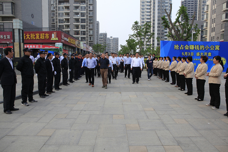 下午16時,公司人員來到最后一站——金泰華城項目,先后參觀了華城案場、華城二期、華城一期及奧晟物業。在金泰華城一期和二期入口處,奧晟物業公司的員工分列站在道路兩側,統一的著裝,整齊的隊列、熱烈的掌聲歡迎大家的到來,很好的展示了物業人員的風采。