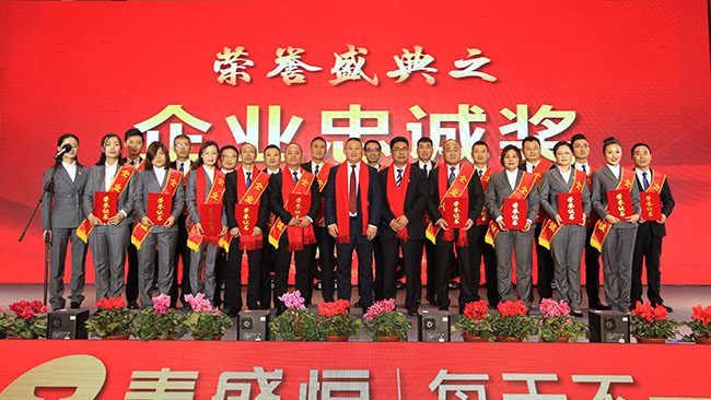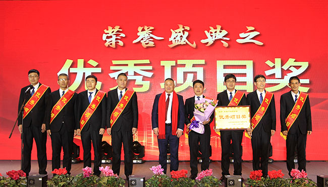 會上,對2017年取得突出成績的優秀團隊及個人,以及在公司工作五年以上的老員工進行了隆重表彰,公司高層領導分別上臺宣布了獲獎名單并為其頒獎。其中,泰盛廣場項目獲得優秀項目獎、營銷管理中心和招采管理中心獲得優秀團隊獎,孫董為獲獎團隊頒獎了榮譽獎牌。成績只代表過去,希望獲獎的團隊及個人在新的一年里戒驕戒躁、再接再厲,充分發揮模范帶頭作用,為公司發展再立新功。